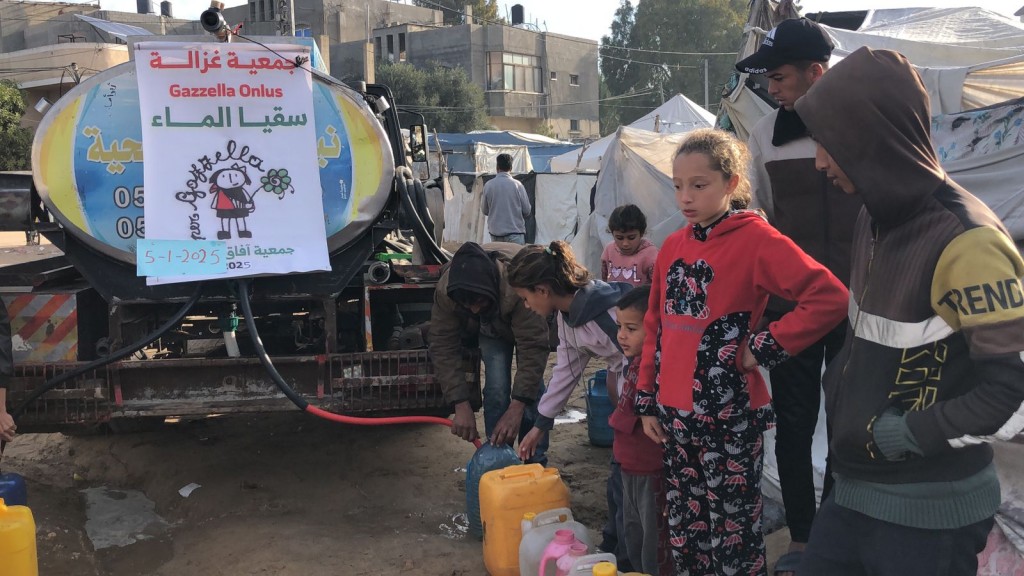 Domenica 5 gennaio 2025, le volontarie e i volontari di Gazzella hanno distribuito 4000 litri di acqua potabile agli sfollati nella tendopoli di Zawaydeh a Deir al-Balah, in collaborazione con l’associazione Afaaq Jadida.