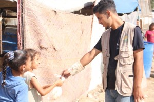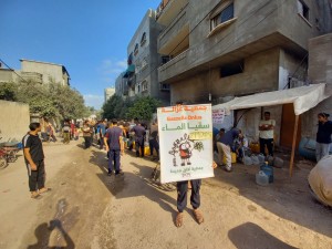 Abbiamo distribuito 8.000 litrid’acqua potabile in due punti di distribuzione davanti alla sede dell’associazione Afaq nel campo profughi nuovo di Nuseirat.