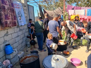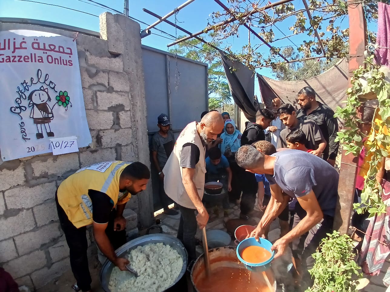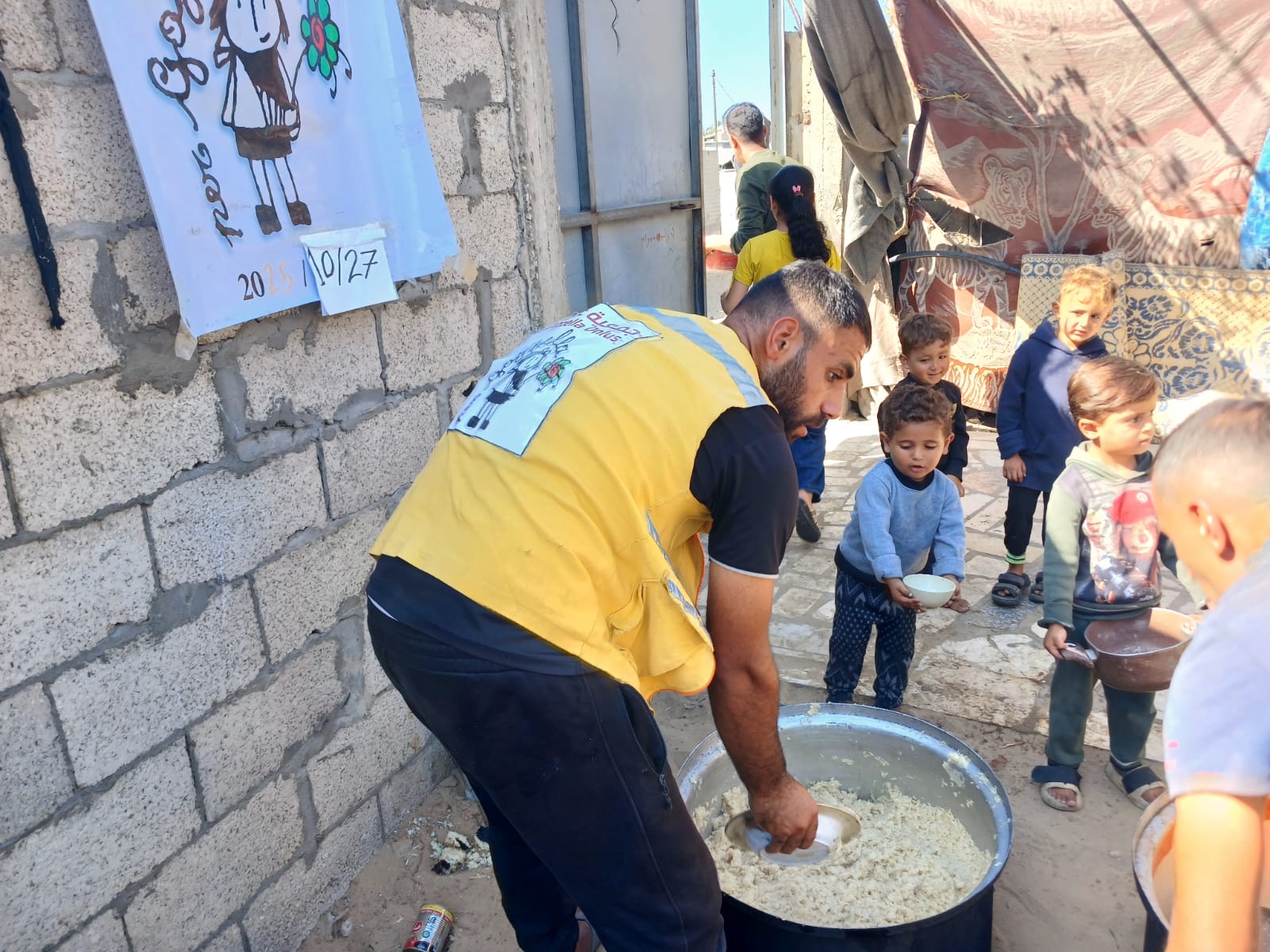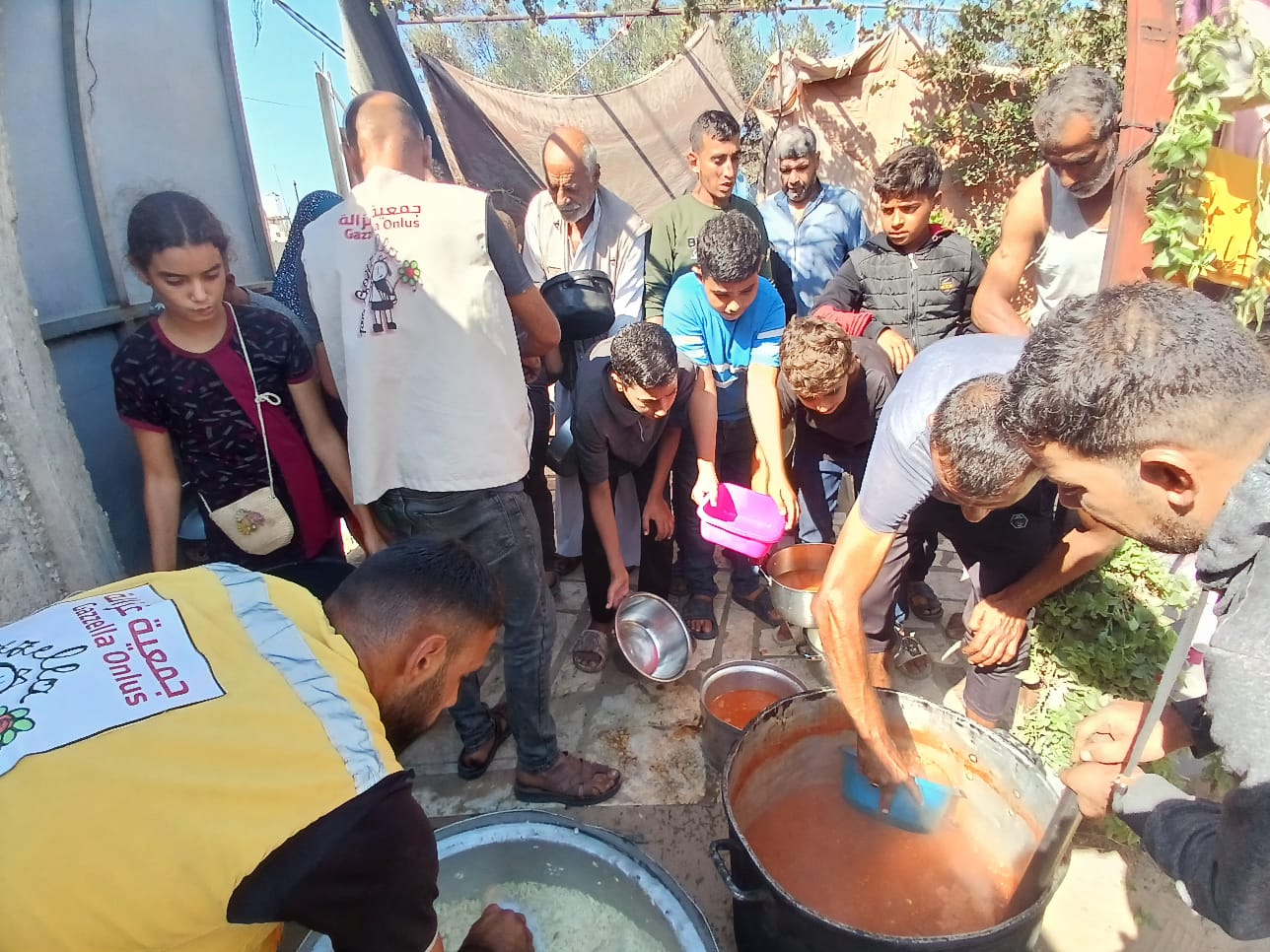 Lunedì 27/10/25 i volontari di Gazzella hanno cotto tre pentole da 100 litri di riso e fagioli al sugo e hanno distribuito il pastocaldo ai profughi nel campo di Bailasan vicino Khan Younes.