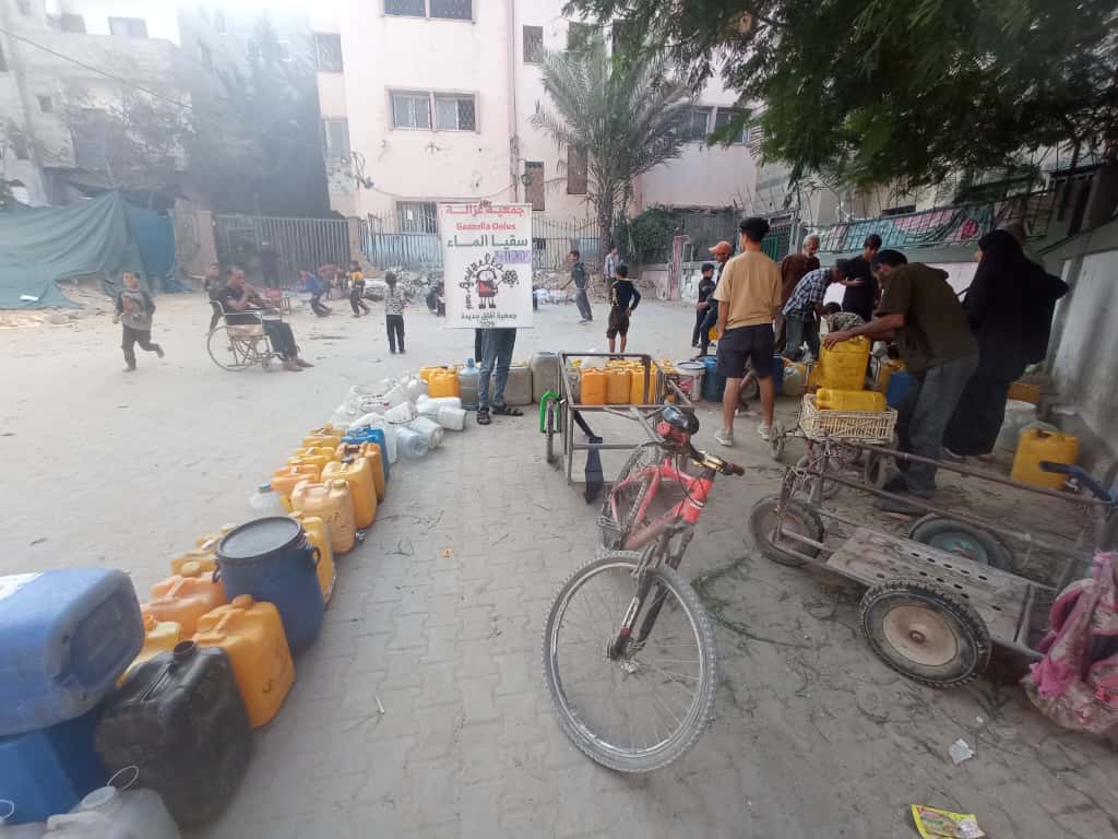 Abbiamo distribuito 4.000 litri d’acqua potabile al punto didistribuzione davanti alla sede dell’associazione Afaq nel campo profughi “Nuovo” di Nuseirat.
