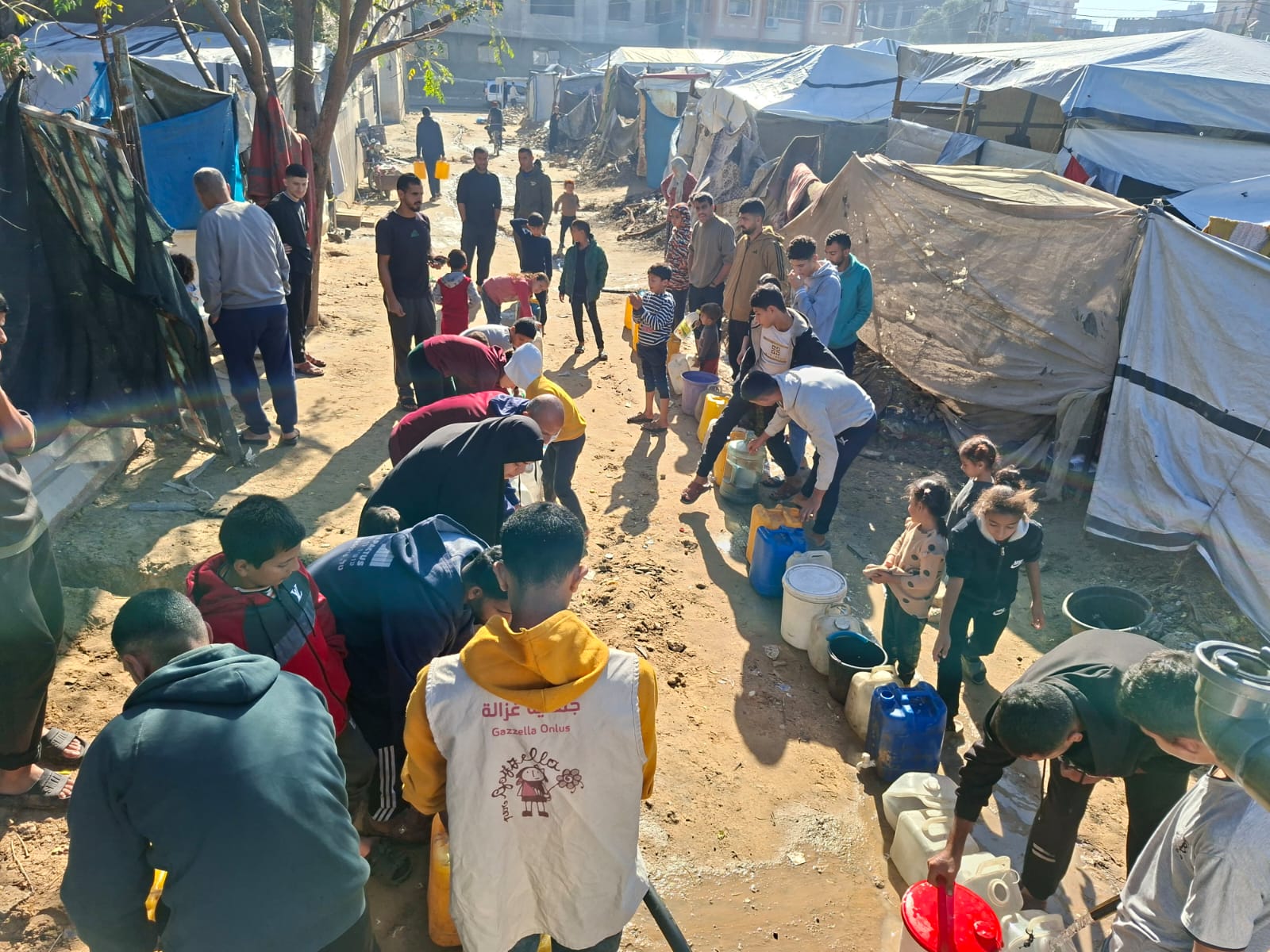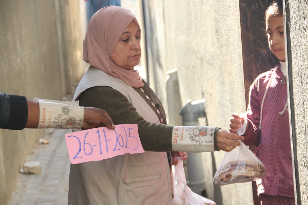 Mercoledì 26/11/25 abbiamo distribuito 10.000 litri d’acqua potabile di cui 3.500 nella zona di Abu Hujeir, 3.500 nel quartiere al-Rahma e 3.000 al punto didistribuzione davanti alla sede dell’associazione Afaq nel campo profughi “Nuovo” di Nuseirat. Abbiamo fatto 1750 pani che abbiamo distribuito nel campo “Nuovo”.