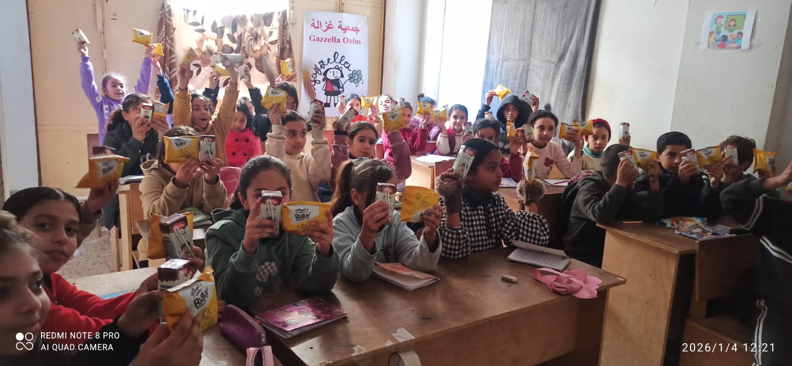 As part of its daily activities, Ghazala School in Deir Al-Balah distributed juice and biscuits to the school’s children today, 4/1.