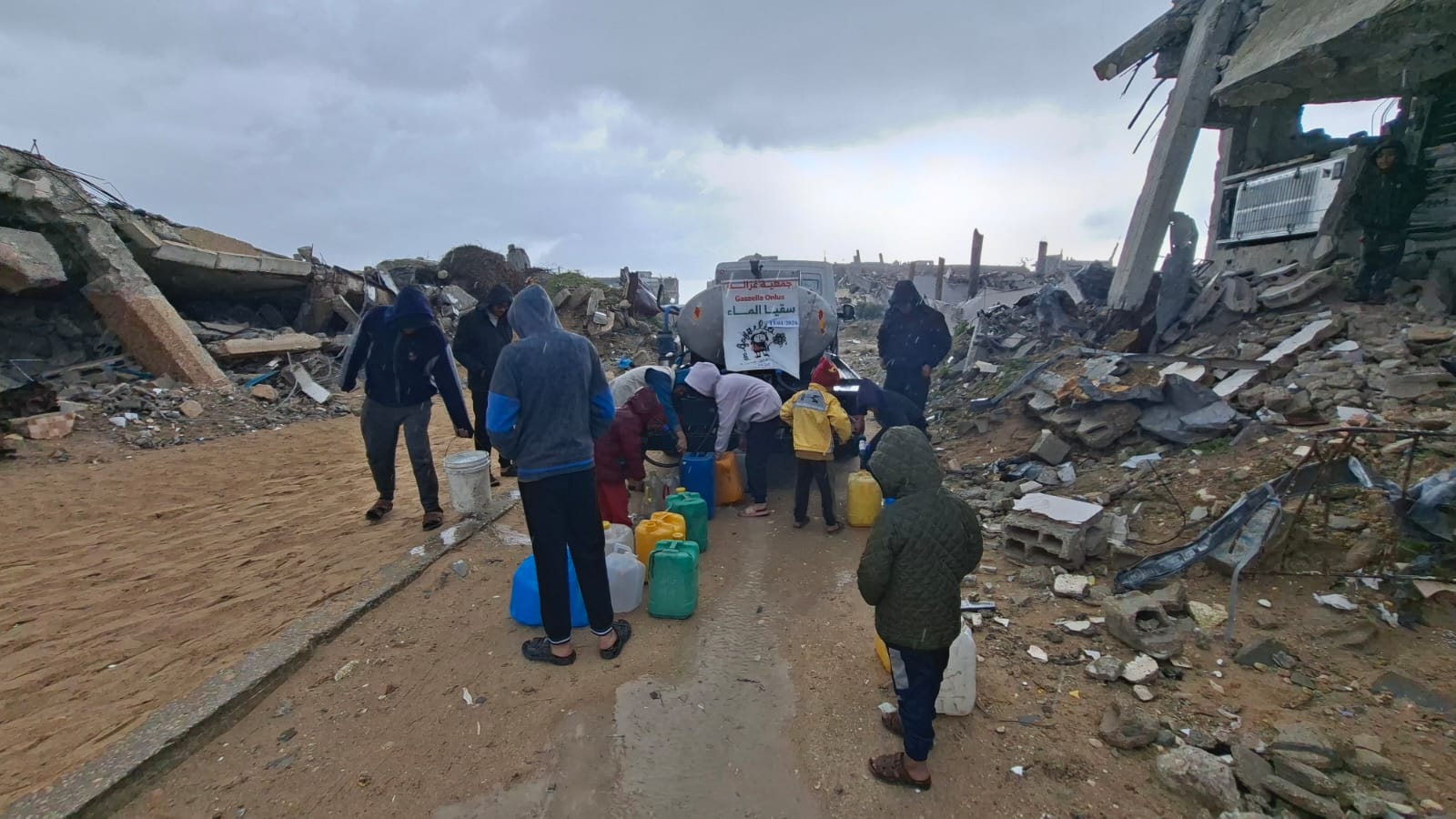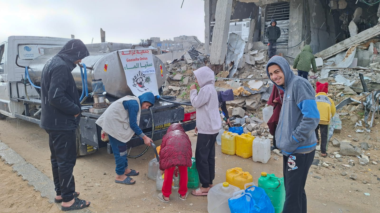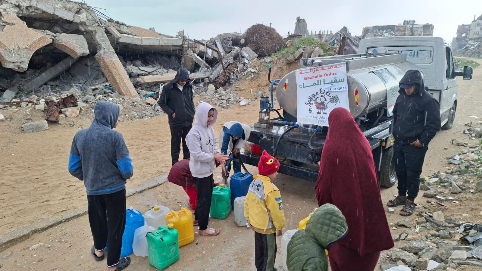 Martedì 13/1/26 abbiamo distribuito 10.000 litri d’acqua potabile di cui 3.500 nella località Ben Jabal, 3.500 litri nella località di Abu Hujeir e 3.000 al punto didistribuzione davanti alla sede dell’associazione Afaq.